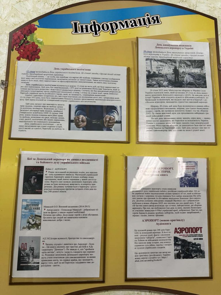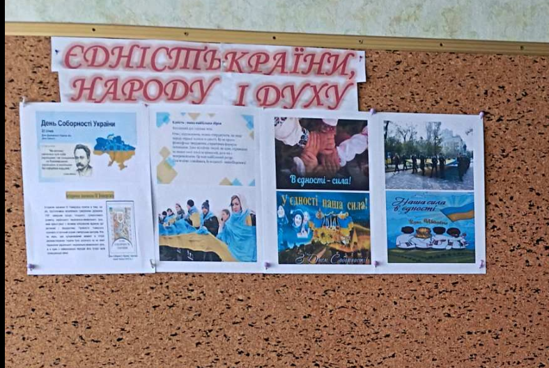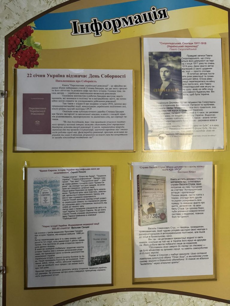 Викладачем захисту України Безерком І.В. оформлено тематичний інформ-дайджест «Єдність країни, народу, духу» та організовано проведення на уроках інформаційно-просвітницьких п’ятихвилинок «Українська державність». Бібліотекарем ліцею Андрейчук І.С. оформлено дайджести «Письменники про Соборність України», «Кіборги».