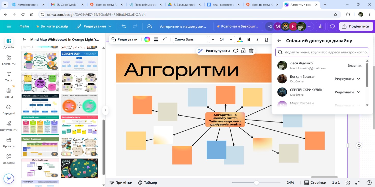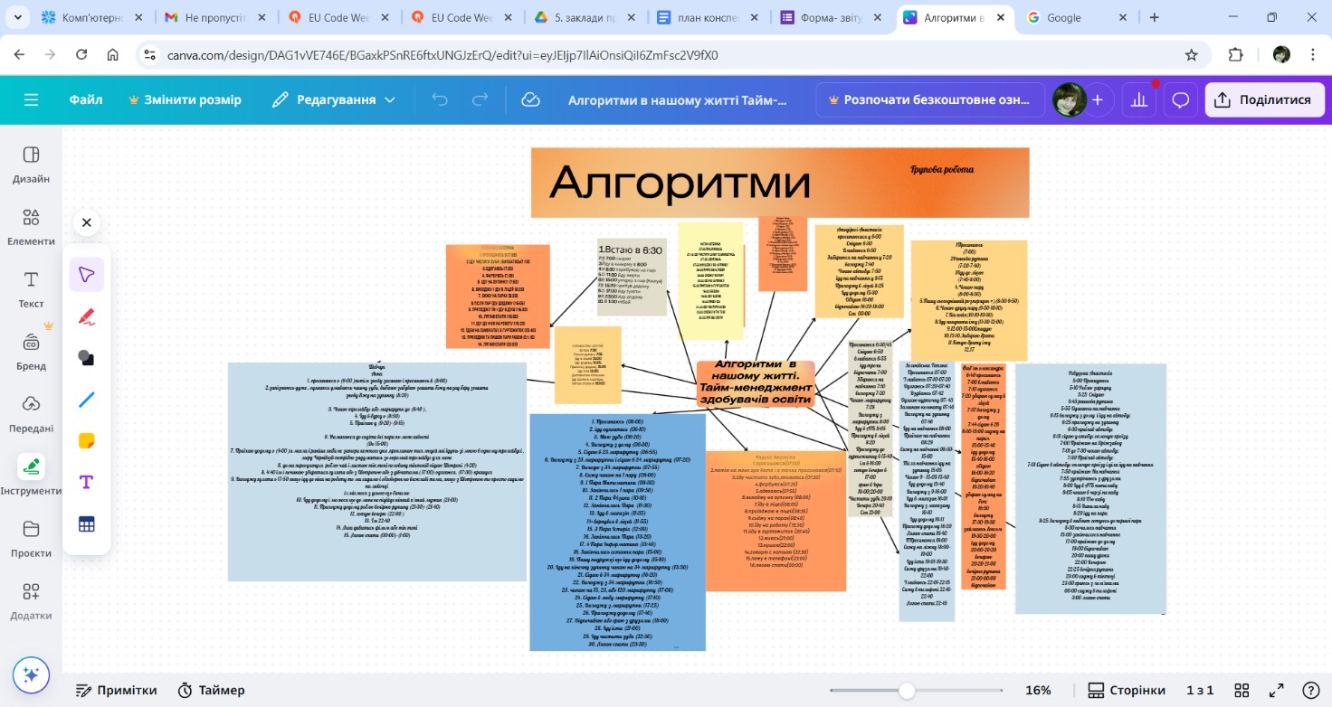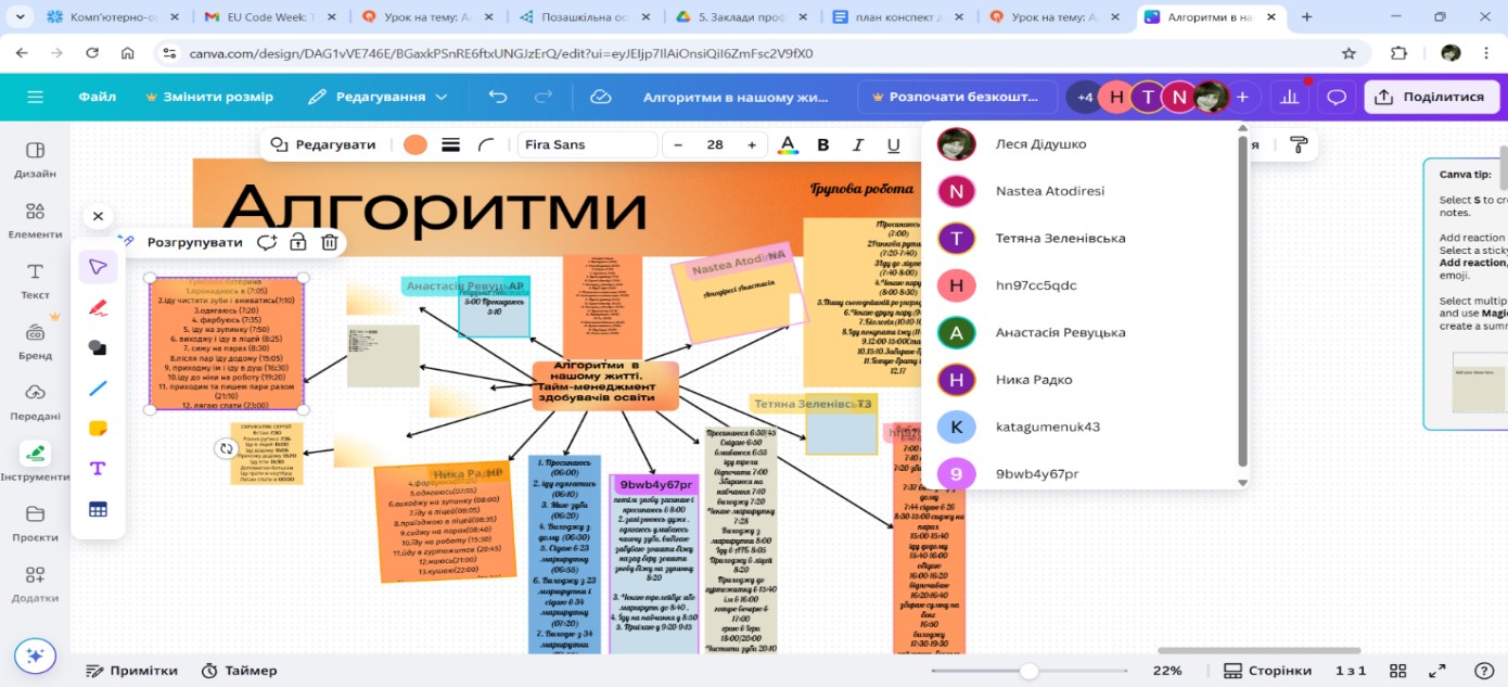 За допомогою онлайн-середовища Canva учасники створили спільну інтерактивну дошку оголошень, де кожен представив власний тайм-менеджмент дня – у вигляді алгоритму дій та візуального плану, що демонстрував послідовність завдань та ефективність самоорганізації.