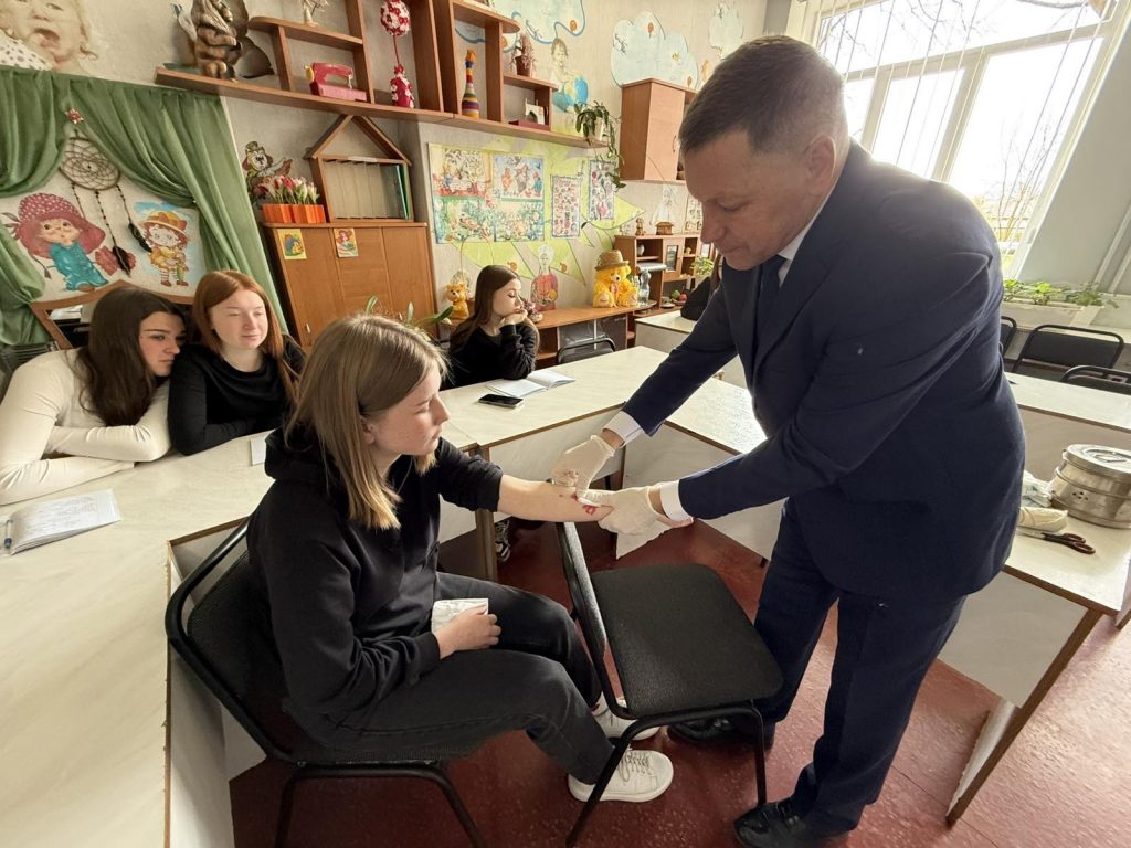 Викладач Захисту України Безерко І.В. провів з групою 5 навчально-практичні заняття з надання долікарської допомоги при травмуванні кінцівок. Студентки відпрацювали методи і способи накладення антисептичних пов’язок на верхню кінцівку і накладення восьмиподібної мобілізуючої на гомілко-ступеневий суглоб.