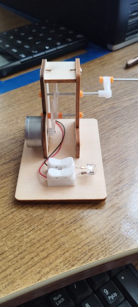 Це діючий макет генераторного механізму, який наочно демонструє перетворення механічної енергії в електричну. Конструкція складається з дерев’яної основи, вертикальної рами, ручки для обертання, двигуна та світлодіода.