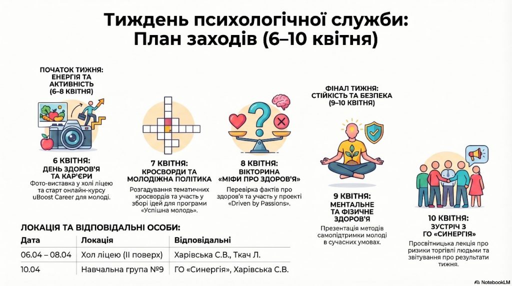 | 2. | 1. Розгадування тематичних кросвордів 2. Організація членів студентського парламенту щодо участі в онлайн опитуванні щодо збору пропозицій та ідей для формування Програми молодіжної політики «Успішна молодь: покоління стійкості». | учнівські групи учнівське самоврядування | 07.04.2026 | ІІ поверх, хол ліцею | практичний психолог Харівська С.В., керівники навчальних груп |