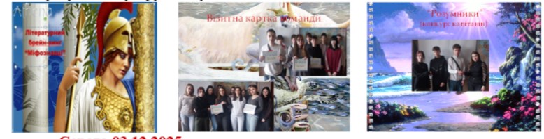 | 3. | Літературний брейн-ринг «Міфознавці». | 02.12.2025 | каб. 14, здобувачі освіти І курсу, грипи 9/10 | Рогозевич Г.М. |