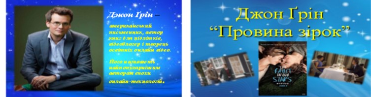 Підготовка методичної розробки відкритого уроку «Джон Майкл Грін – американський письменник, автор книжок для підлітків та молоді, відеоблогер. «Провина зірок» – розповідь про історію кохання невиліковно хворих юнака та дівчини».