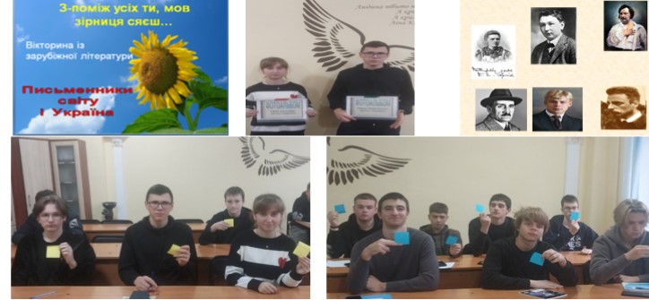 Вікторина «З-поміж усіх ти, мов зірниця сяєш…» (письменники світу і Україна) відбулася між командами здобувачів освіти ІІ курсу. Учасники гри досліджували, як долі і творчість зарубіжних письменників пов’язані з Україною, розкривали цікаві факти з життя митців, які стосуються їхнього перебування на українській землі, з’ясовували вплив української культури на творчість світових письменників.